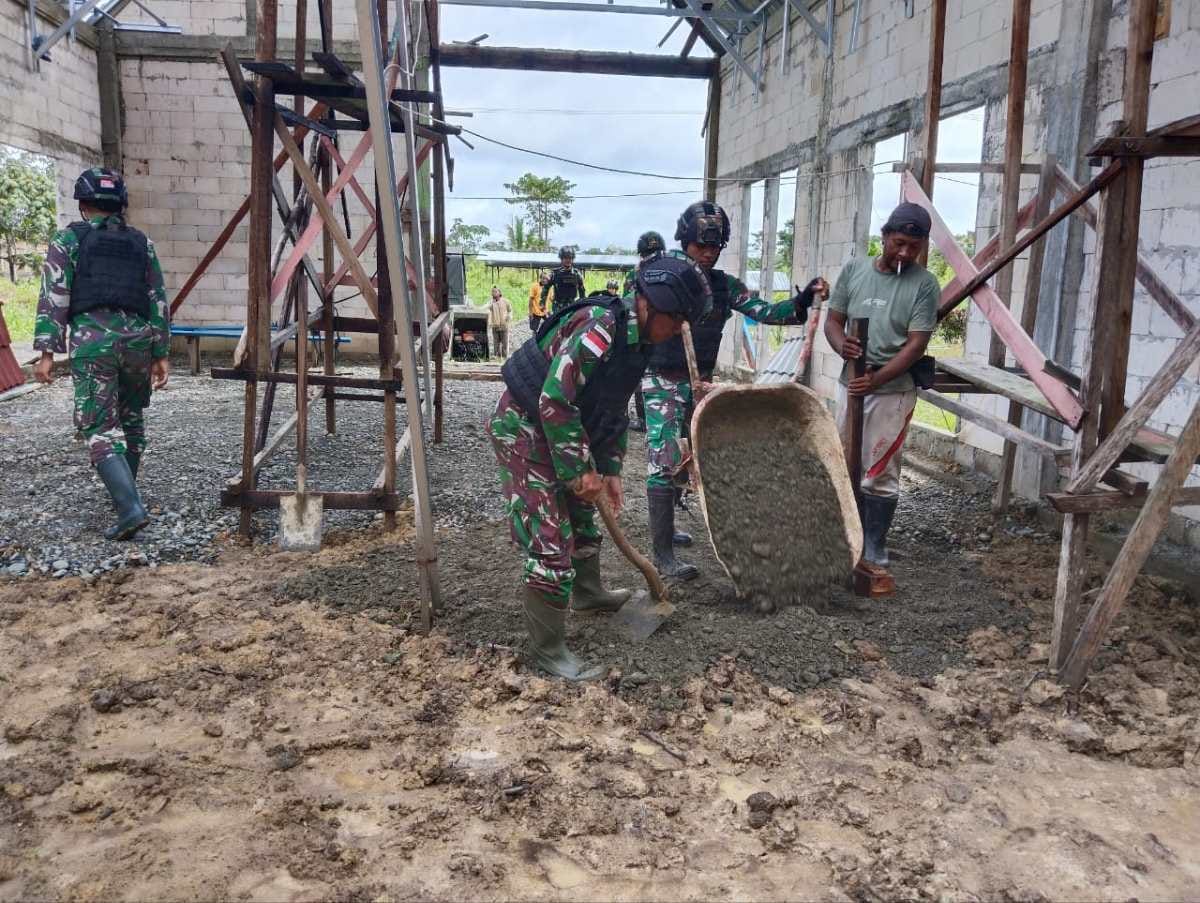 KEEROM | Infomedia Nusantara – Membantu percepatan pembangunan Gereja Alfa SP2 Soom Woslay, Pos Senggi Satgas Yonif 310/KK bersama masyarakat bergotong royong bangun Gereja di Kampung Woslay, Distrik Senggi, Kabupaten Keerom, Sabtu (13/4/2024).