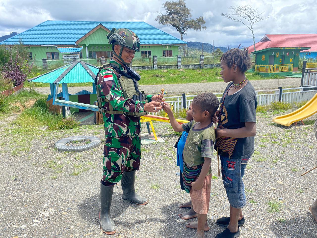 INTAN JAYA | Infomedia Nusantara – Sebagai wujud kedekatan dan keharmonisan antara TNI dan warga khususnya anak-anak di Kampung Mamba, Prajurit Ksatria Condromowo membagikan permen kepada anak-anak Papua di Pos Mamba, Distrik Sugapa, Kab. Intan Jaya. Selasa (16/04/2024).