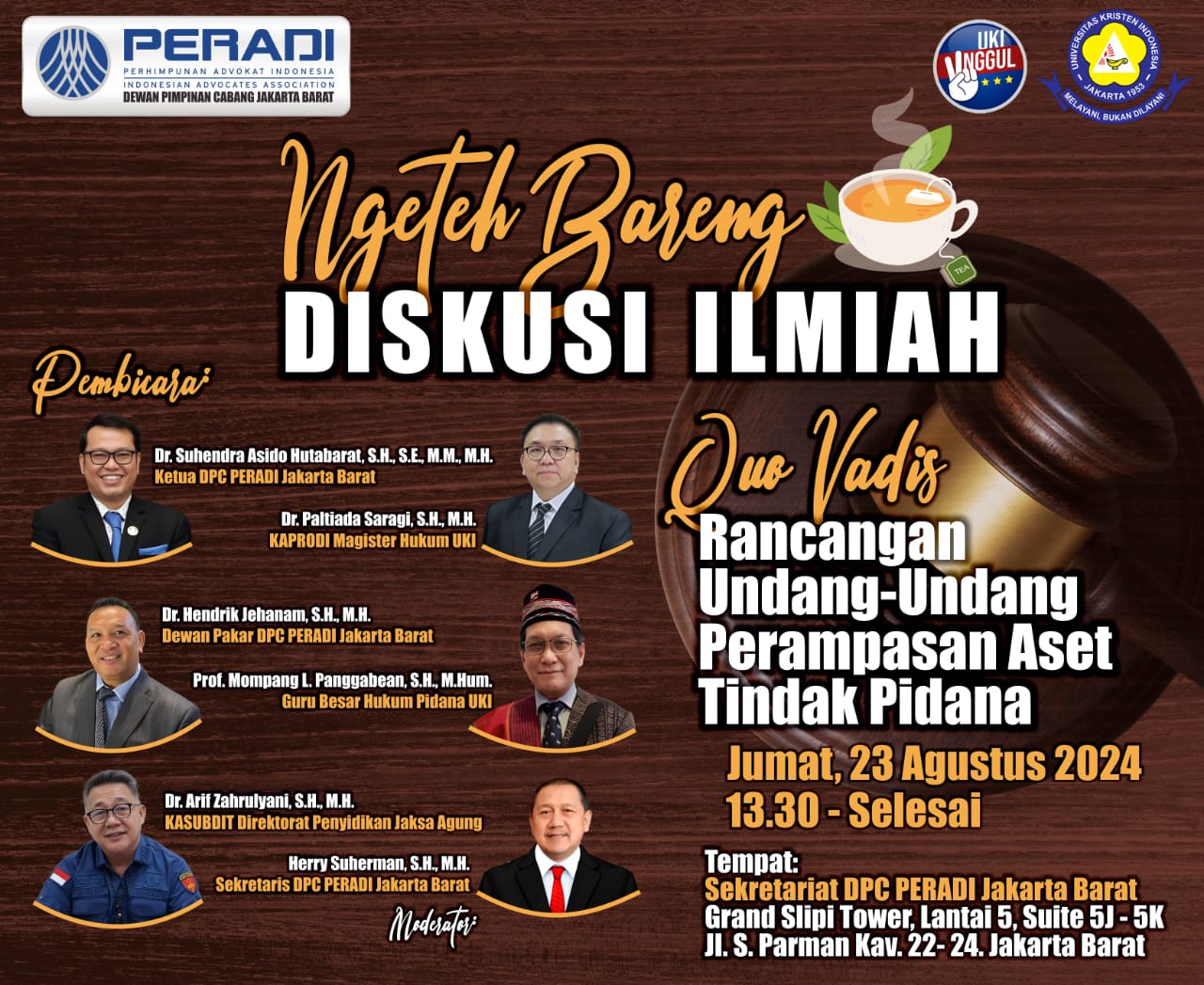 JAKARTA |Infomedia Nusantara – Jumat (23/08/2024), pukul 13.30 WIB, bertempat di Ruang Serbaguna Sekretariat DPC Peradi Jakarta Barat, Grand Slipi Tower lantai 5, jalan Jenderal S. Parman, Jakarta Barat, diadakan Diskusi dengan tema, “Ngeteh Bareng Diskusi Ilmiah: Qou Vadis Rancangan Undang-undang Perampasan Aset Tindak Pidana”. Acara terselenggara atas kerjasama DPC Peradi Jakarta Barat dan Universitas Kristen Indonesia atau UKI. Acara berlangsung secara hybrid (online dan offline).