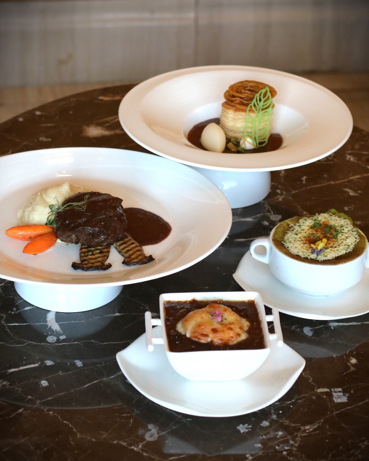 Untuk hidangan pembuka, tersedia pilihan seperti Asparagus and Spinach Souffle seharga Rp 70.000/porsi dan Soupe A L’oignon Gratinee seharga Rp 60.000/porsi. Untuk hidangan utama, tamu dapat menikmati Le Fillet Mignon Bordelaise Jus seharga Rp 240.000/porsi kemudian ditutup dengan makanan penutup yang renyah dan manis, yaitu Tarte Tatin seharga Rp 70.000/porsi.